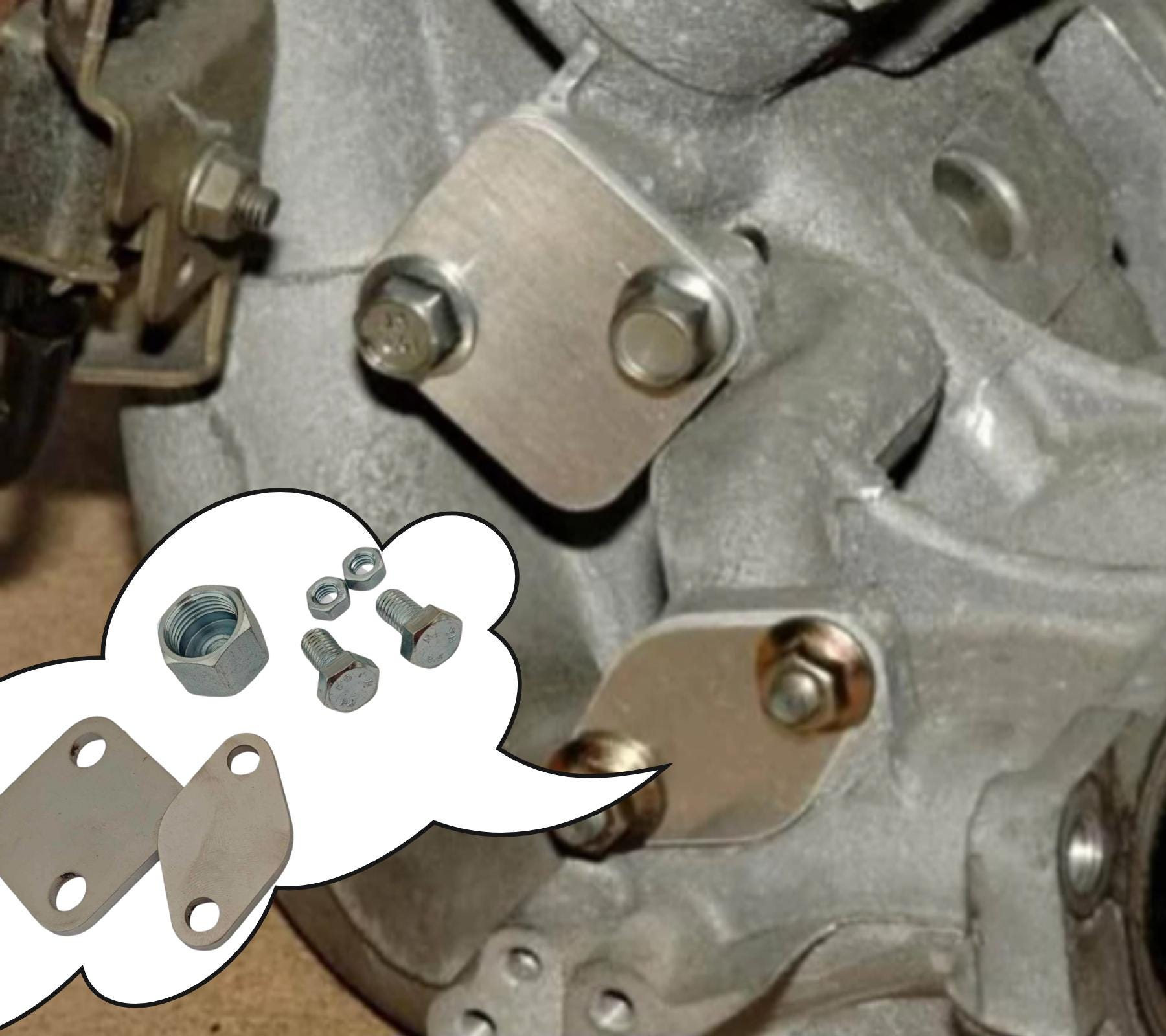 The block-off plates are installed in place of the factory EGR valve and the tube connecting the intake manifold to the exhaust manifold, allowing you to completely remove the exhaust gas recirculation system from your car.